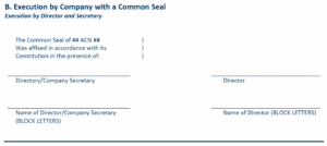 Under Section 127 of the Act, a company may execute documents using its common seal (usually a stamp stating the company name and its ACN) or the now more common method of choosing to execute documents without using a common seal by use of words stating the company is executing the document. In both instances, the document must be signed by: